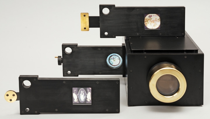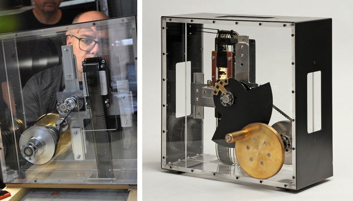 Kombinationsgerät für Aufnahme, Kopie und Projektion von Film. Nachbau des originalen Greifer-Mechanismus zum Transport einer Filmrolle, Herstellung aller Feinmechanik. | Konzept: ATELIER BRÜCKNER, Stuttgart | Umsetzung: id3d-berlin mit Frank Fietzek -