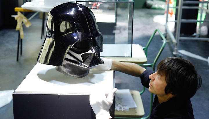 Einbringung der originalen Maske „Darth Vader“ in ihre Vitrine.