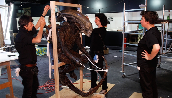 Einbringung des originalen Maskenkostüm „Alien“ in seine Vitrine.